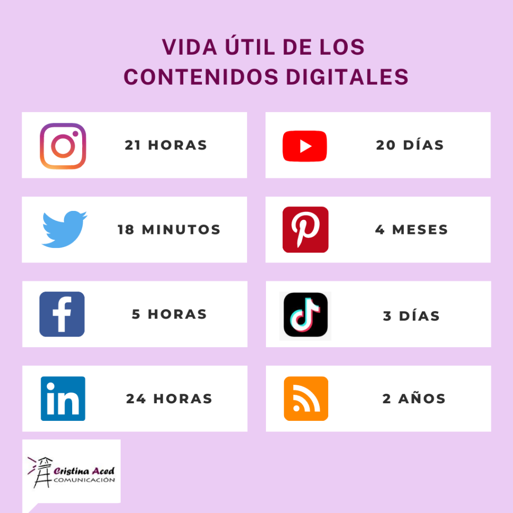 ¿Sabes cuánto duran tus contenidos en redes sociales? La vida útil de lo que publicamos depende de muchos factores: el tipo de contenido, el valor que aporta, la viralidad que consiga… Pero diversas fuentes coinciden en que la vida media de una publicación en cada red social es aproximadamente ésta: