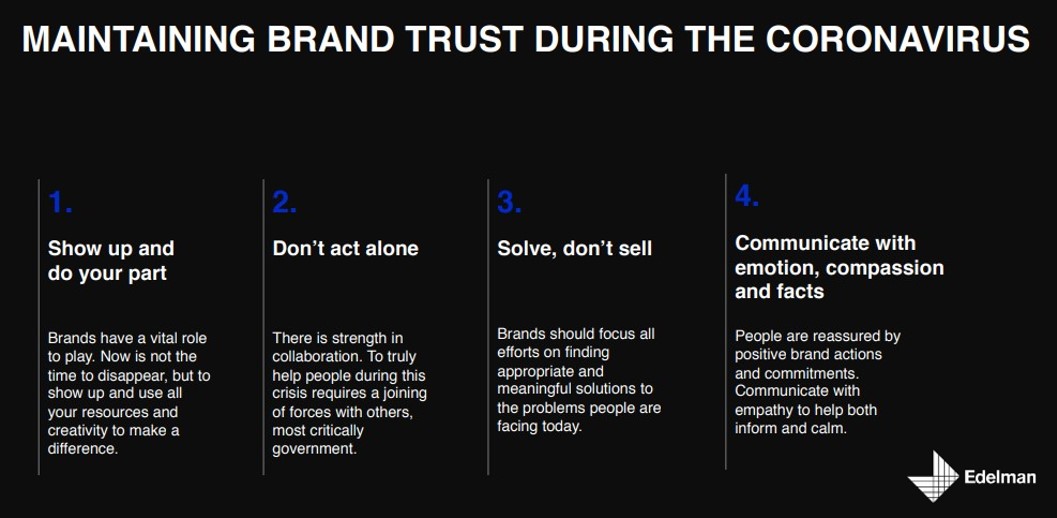 “Da soluciones, no vendas”. Es el consejo que da Edelman para mantener la confianza de marca durante el coronavirus, a partir de los resultados de su estudio. Hemos visto como algunas marcas han adaptado sus líneas de producción para fabricar productos de primera necesidad: Seat pasó de fabricar coches a respiradores y Bosch de fabricar electrodomésticos a mascarillas, por poner solo dos ejemplos. “Y lo han sabido comunicar, pues de eso se trata, de hacer saber que se han convertido en colaboradores necesarios de las administraciones públicas en la solución a la pandemia”, explica Xifra.