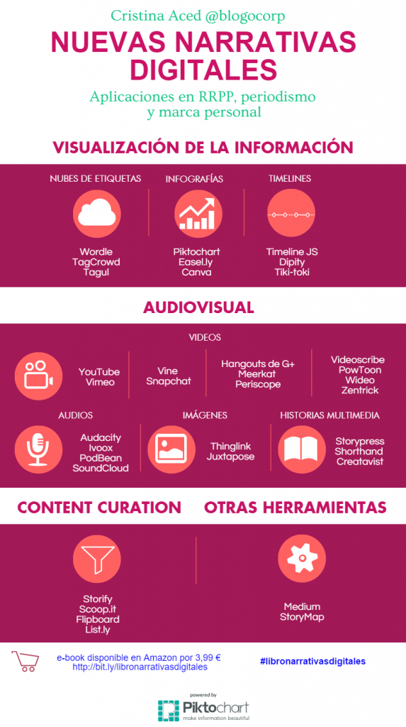 Nuevas narrativas digitales responde a todas estas preguntas y te ayuda a aprovechar las oportunidades narrativas de Internet. El libro recoge más de 100 ejemplos de buenas prácticas y presenta 35 herramientas gratuitas. En esta infografía diseñada con Piktochart puedes ver las herramientas que se explican en el libro. ¡Nada mejor que una representación visual para resumir un libro que habla sobre contenidos visuales! 😉 Nuevas narrativas digitales está disponible en Amazon por 3,95 €
